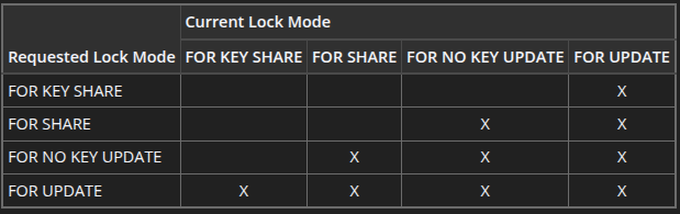 FOR UPDATE: highest row lock, you can’t delete, update on the row when this lock is acquired by other transaction. It’s self conflicting, so you can’t use twoFOR UPDATEconcurrently. You can still read it through normalSELECT. It’s obtained byDELETE,UPDATE (key),SELECTcommands.FOR NO KEY UPDATE: acquired for updates to column without a unique index. It’s weakerFOR UPDATEas it allowsSELECT FOR KEY SHARE.FOR SHARE: true shared lock, it can be acquired by multiple transactions. When acquired, it blocks modification to rowFOR KEY SHARE: likeFOR SHAREbut allows update to column without unique index.