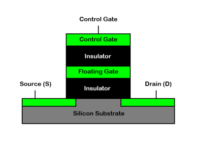 NAND flash cell has a control gate and a floating gate, separated by a thin oxide layer. The floating gate can