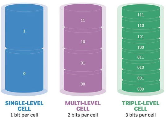 - SLC (single-level) -> 1 bit, MLC (multi-level) -> 2 bits, TLC (triple-level) -> 3 bits, and QLC (quad-level) -> 4 bits.