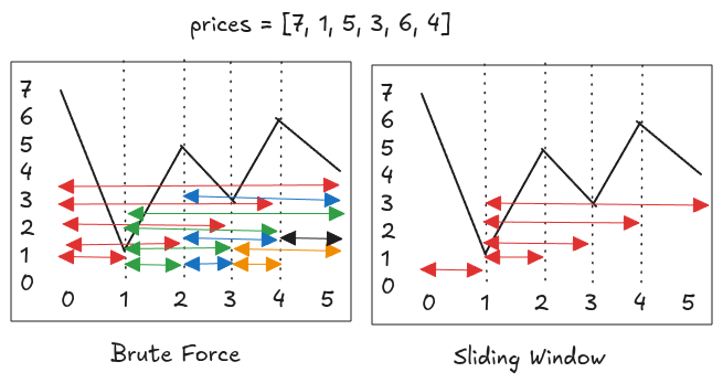 This way, by always keeping \(l\) at the minimum price seen so far and scanning \(r\) once, we efficiently ignore non-profitable and suboptimal windows while computing the maximum profit in a single pass.