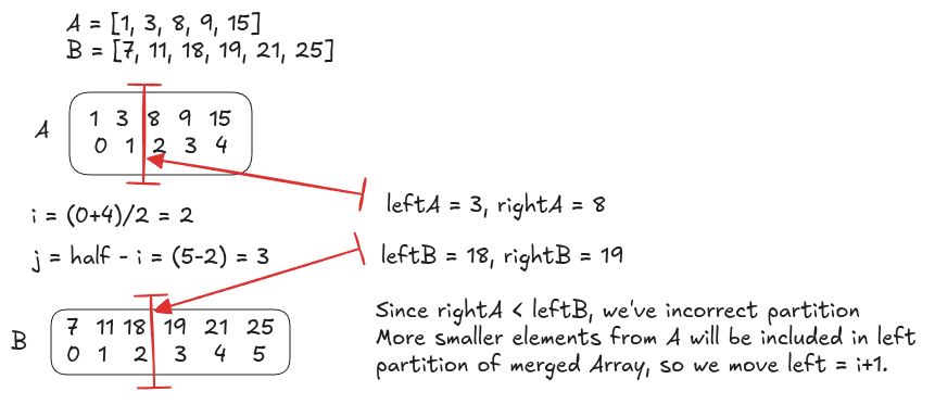 Instead of merging, we apply binary search on the smaller array to find a valid partition between the two arrays such that: