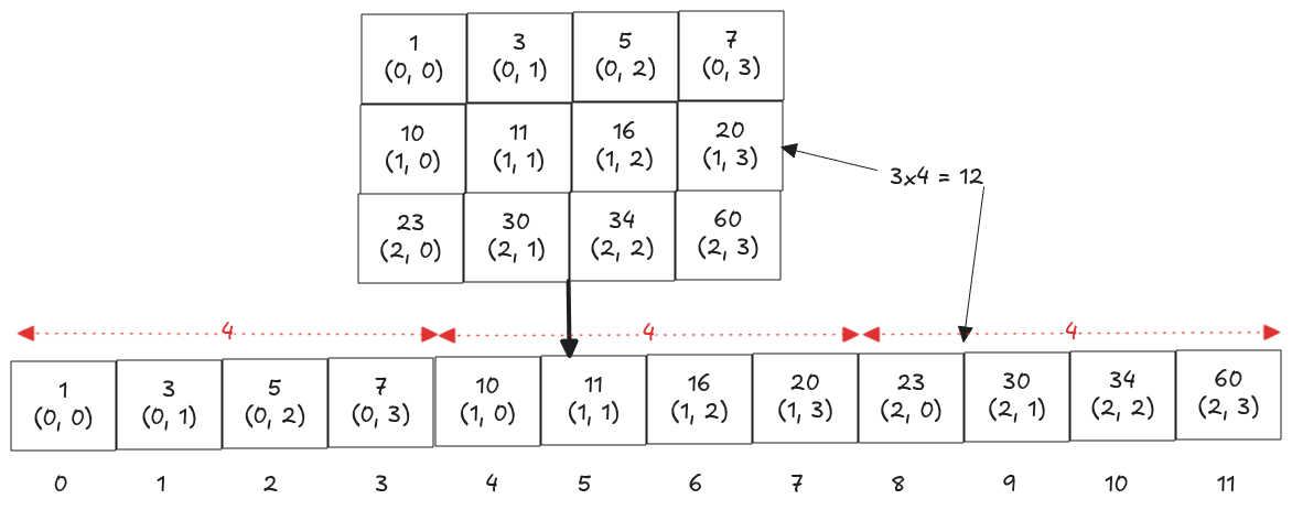 The key idea is to treat the 2D matrix as a 1D array, which reduces the problem to a classic binary search. This conceptual flattening is illustrated on the right. Once flattened, we map an index \(k\) in the 1D array back to its corresponding \((row,col)\) position in the matrix.